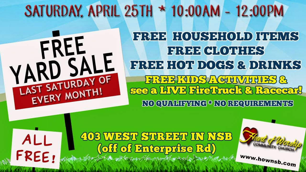 Each Month the Heart of Worship Community Church holds a free yard sale at 403 West Street in New Smyrna Beach. It is held the last Saturday of each month and yes, everything is free! Household items, clothes, hot dogs and drinks. They have activities for the kids and this month there will be a fire truck and a race car there to check out.
